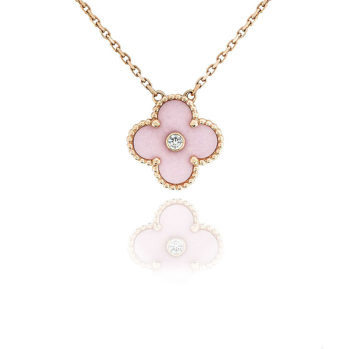 This limited-edition pendant reimagines the timeless four-leaf clover in soft blush porcelain, framed by a warm rose gold–tone border. The smooth, glossy finish of the porcelain contrasts beautifully with the metallic edging, offering a delicate balance of elegance and versatility.