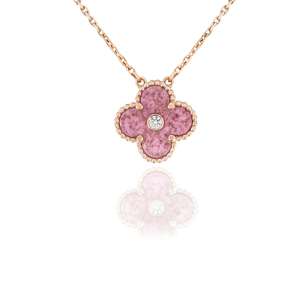 This limited-edition pendant celebrates timeless elegance with a classic four-leaf clover design, brought to life through a striking rhodonite center. Framed in a warm rose gold–tone border, the natural pink hues of the stone add both softness and depth, creating a piece that feels unique yet enduringly stylish.
