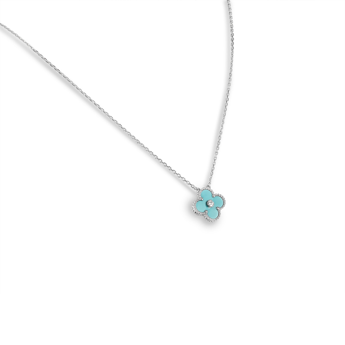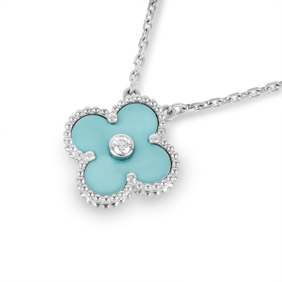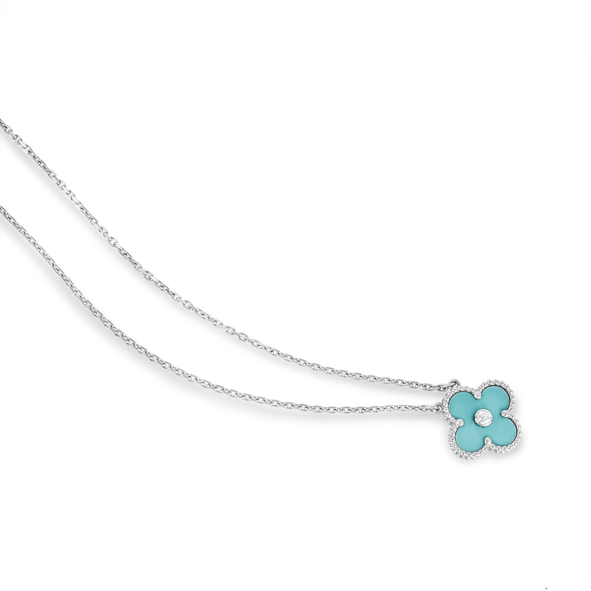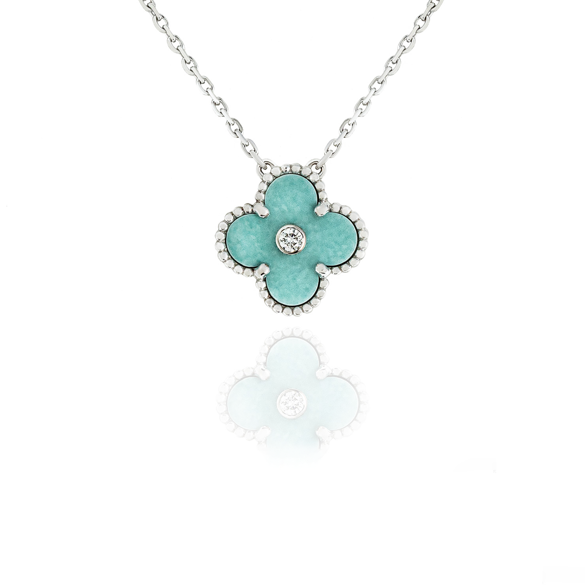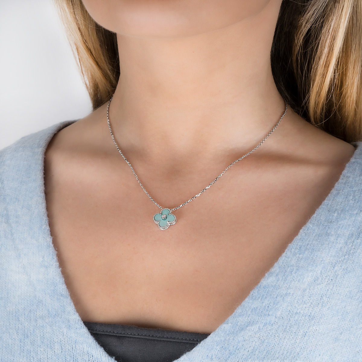 This limited-edition pendant highlights the elegance of the four-leaf clover, crafted with a serene celadon porcelain center and framed by a luminous white gold–tone border. The soft green hue brings a sense of calm sophistication, making it both unique and versatile.