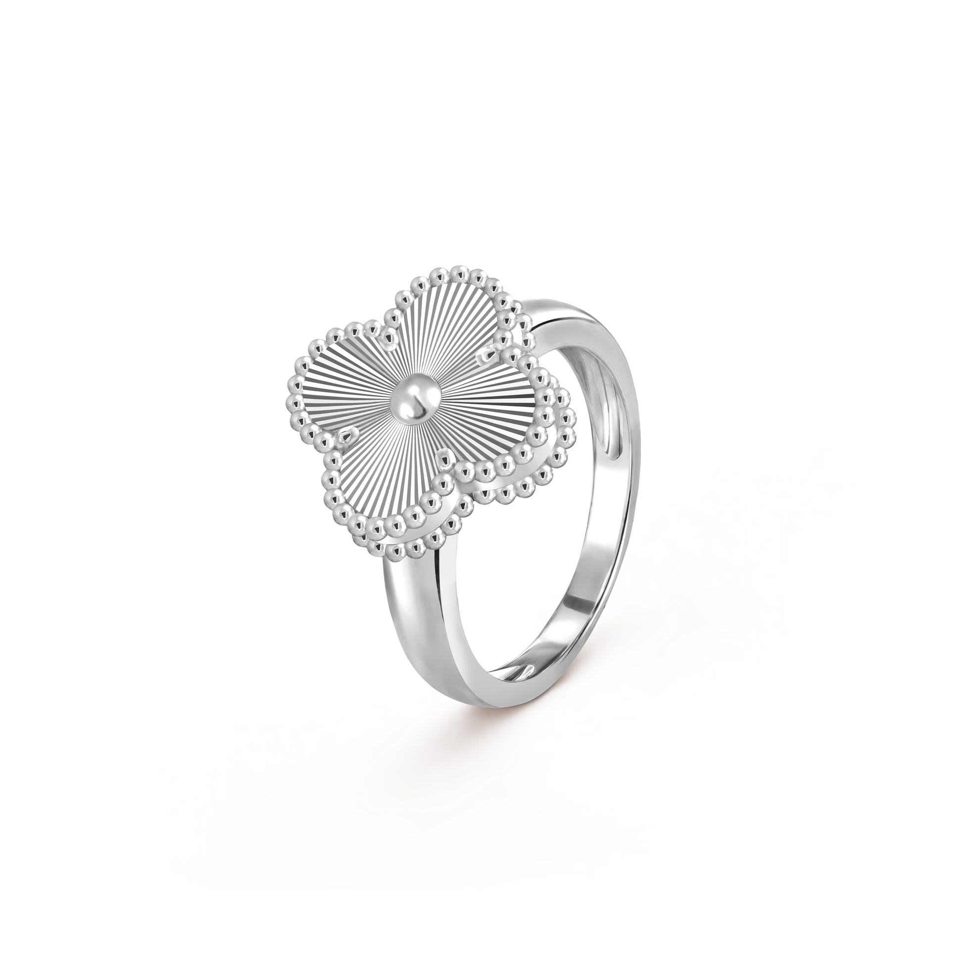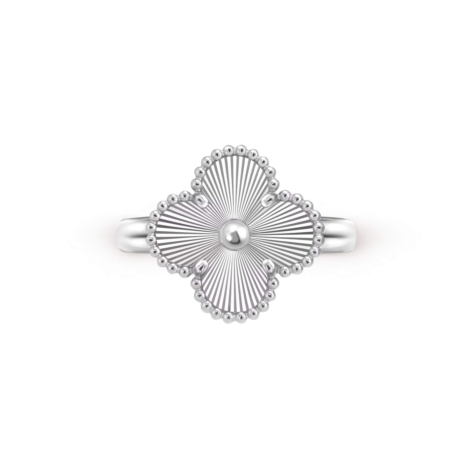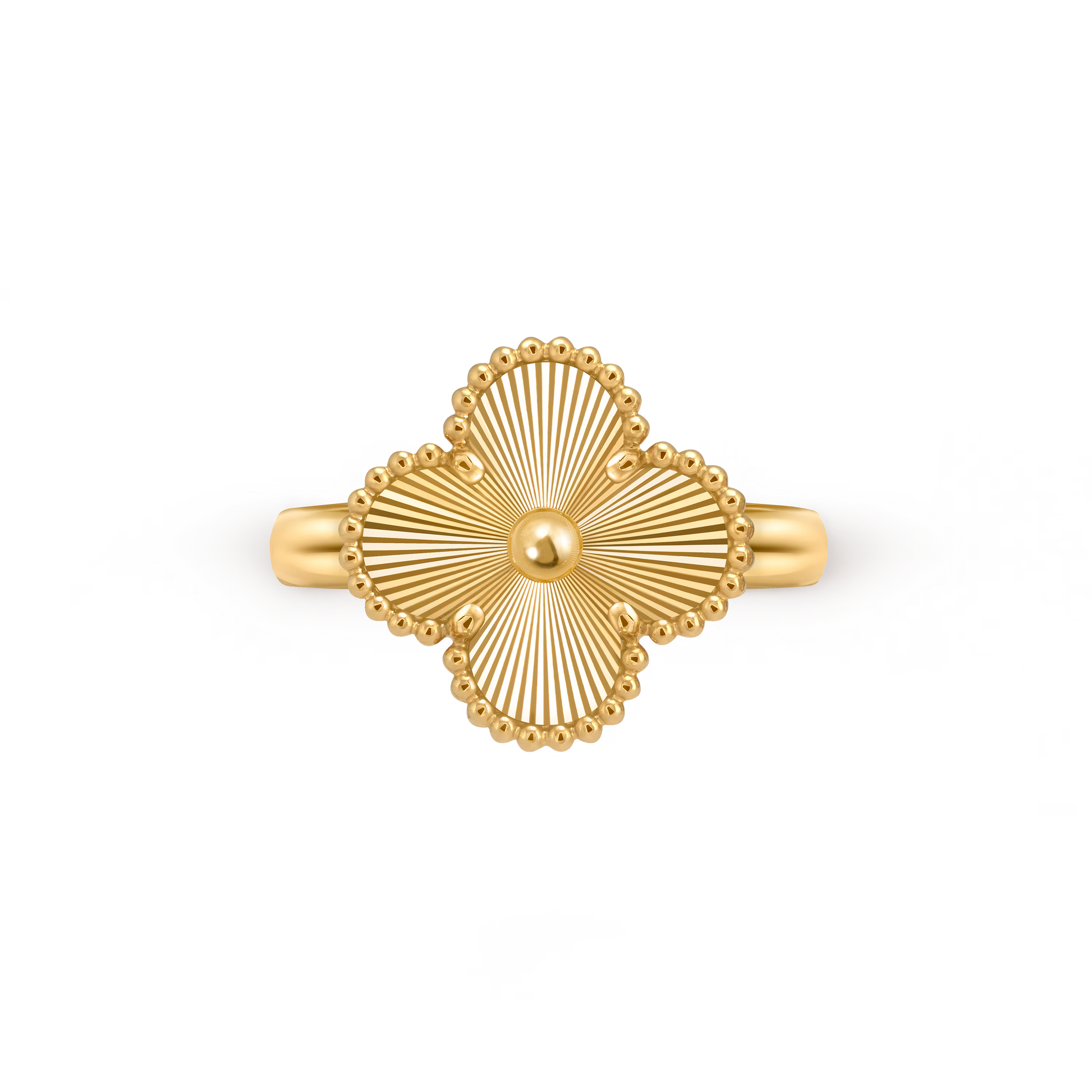Our Lumière Lucky Clover Ring captures the light in the most enchanting way. Featuring the iconic four-leaf clover design, this piece is finished with delicate beaded edges and a guilloché sunburst engraving that reflects brilliance from every angle. Its golden tones and refined detailing make it the perfect ring to elevate both everyday looks and special occasions.