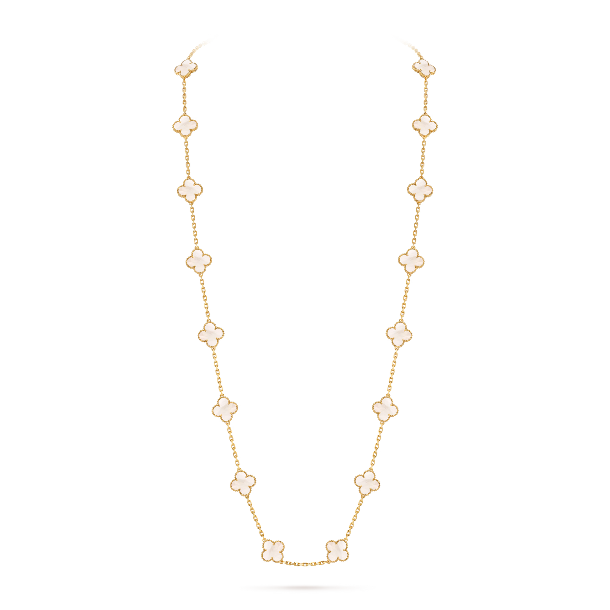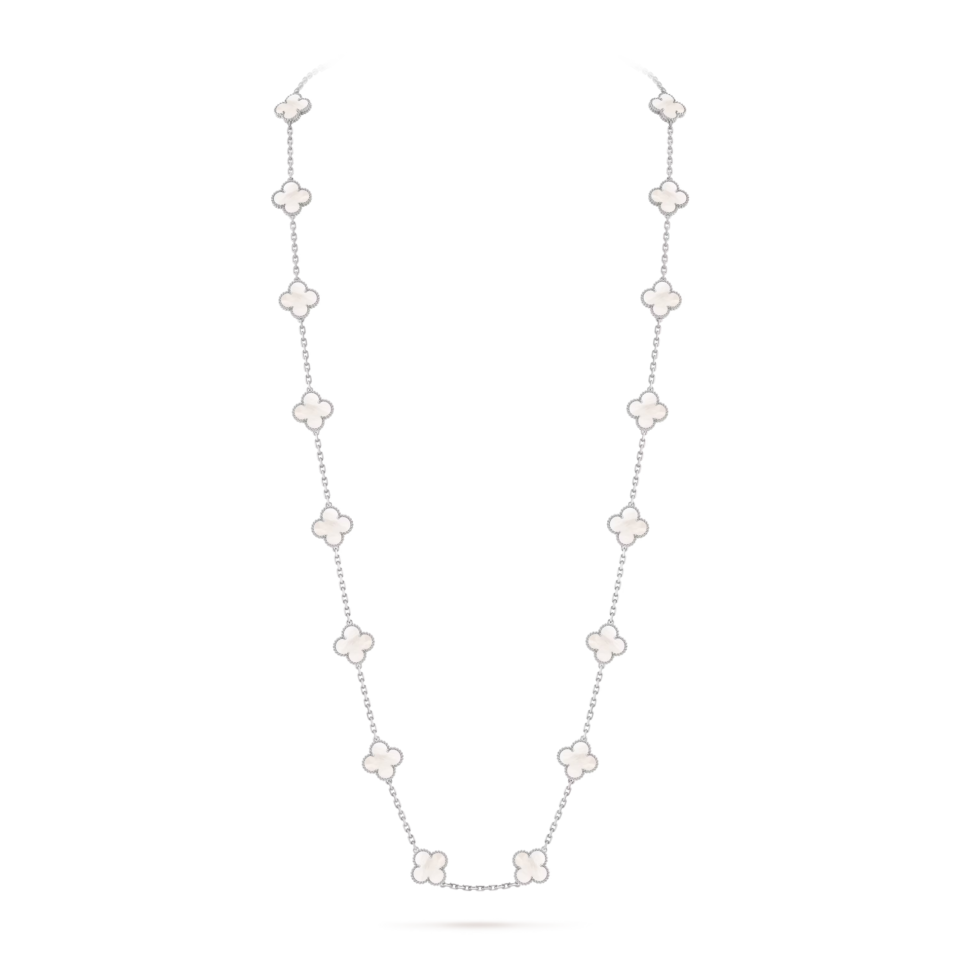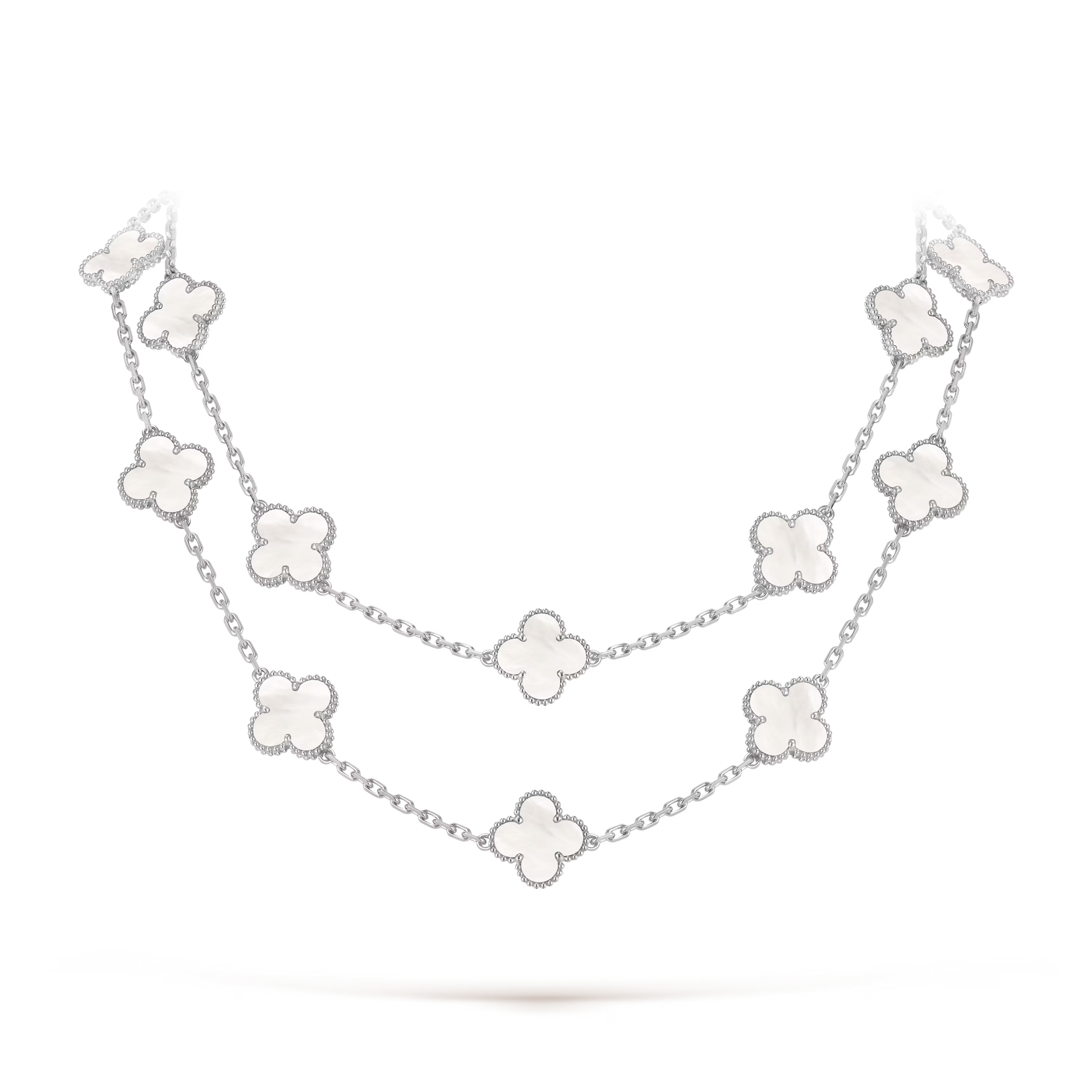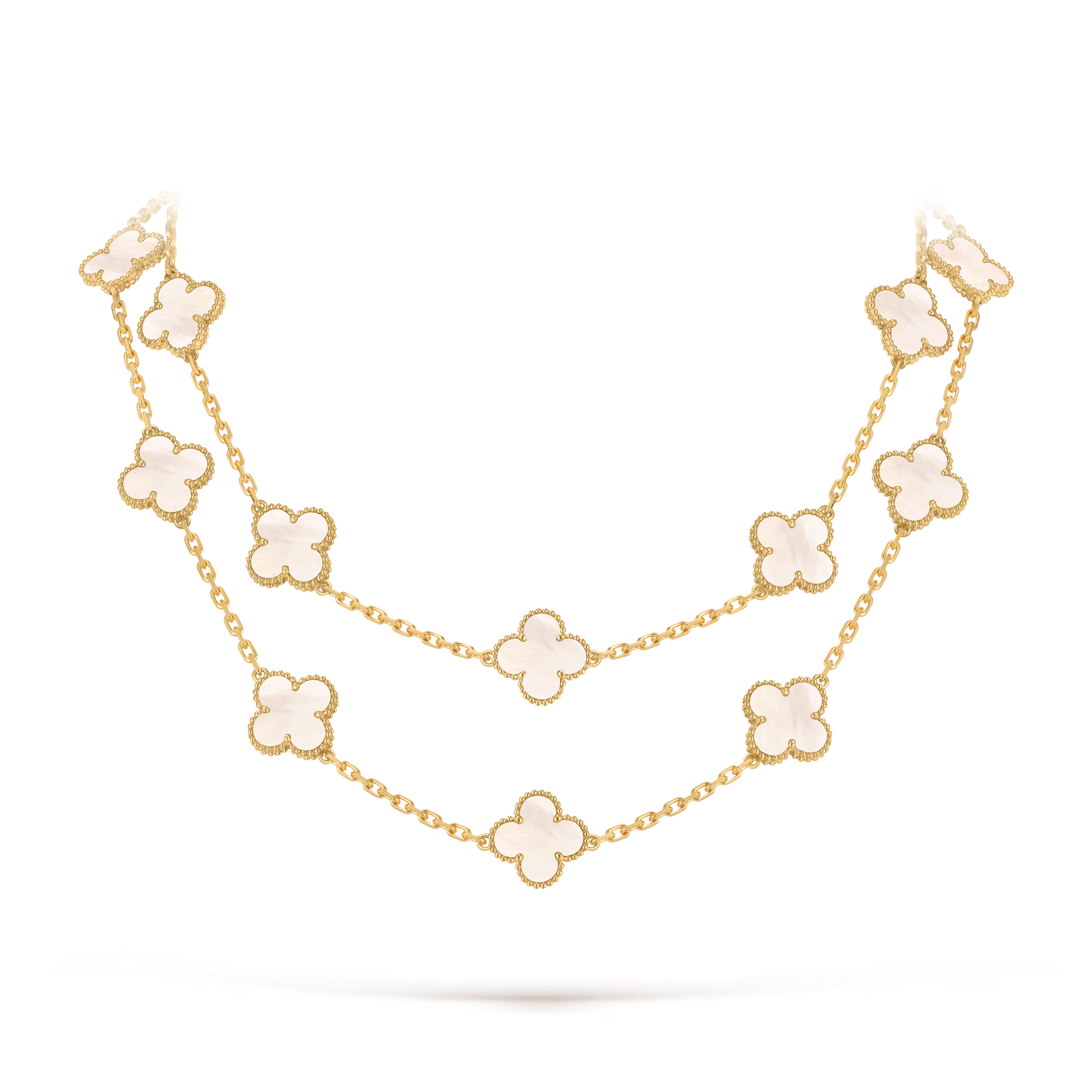 A statement of grace and sophistication, the Lucky Clover Long Necklace features twenty delicately crafted clovers, elegantly linked to create a flowing silhouette of timeless charm. With double the motifs, this piece embodies abundance, luck, and beauty in every detail.
